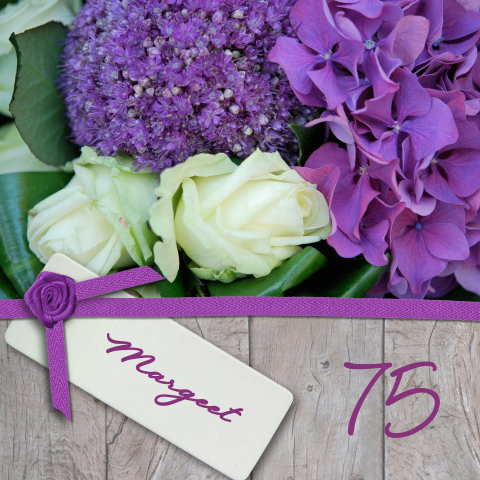 Verjaardagskaart 75e jaar paars met hout en bloemen stijlvol